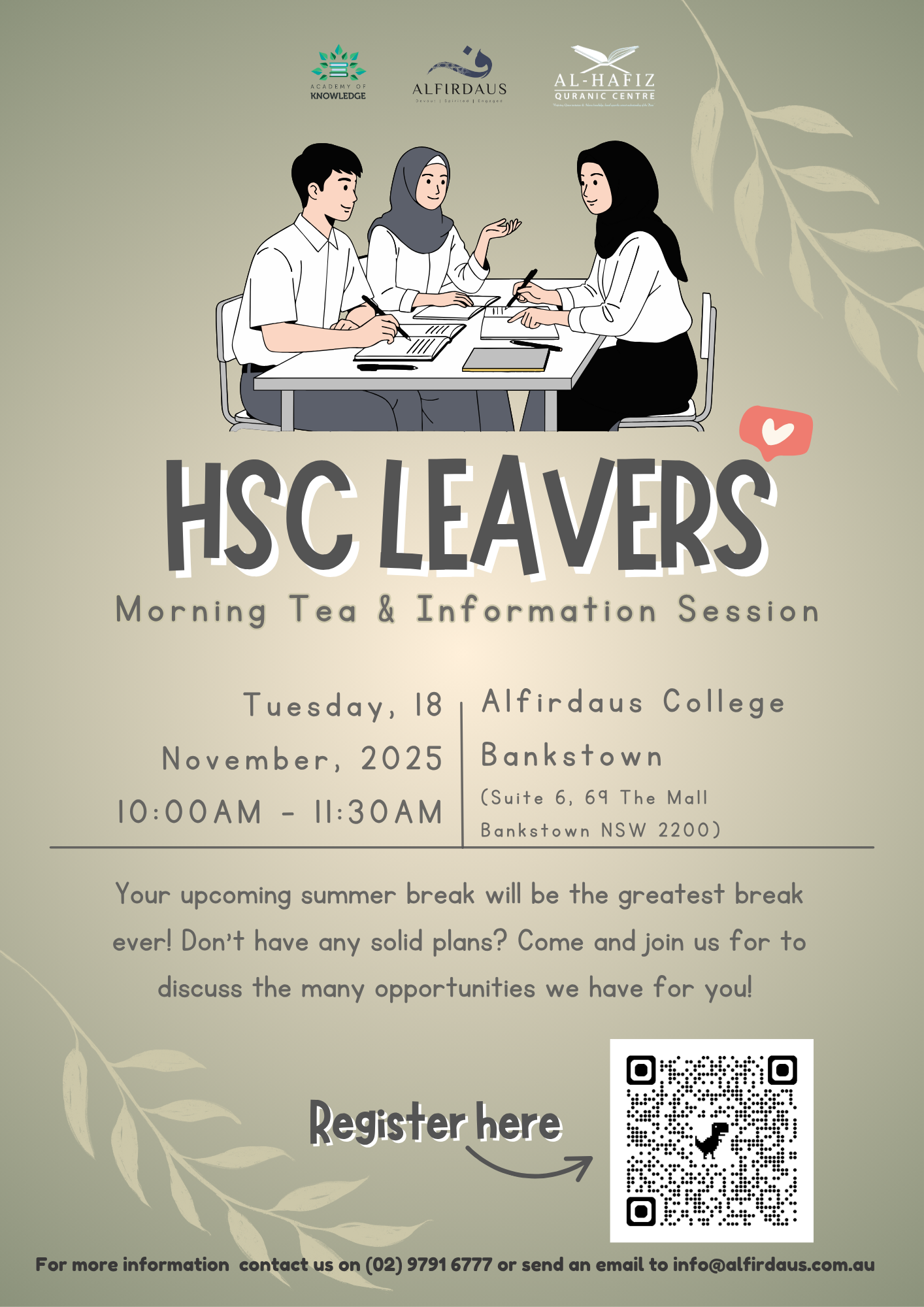 Alfirdaus College, Academy of Knowledge and Al Hafiz Centre is pleased to invite Muslim HSC leavers to our morning tea and information session. Join the brotherhood and sisterhood plus find out more about our: