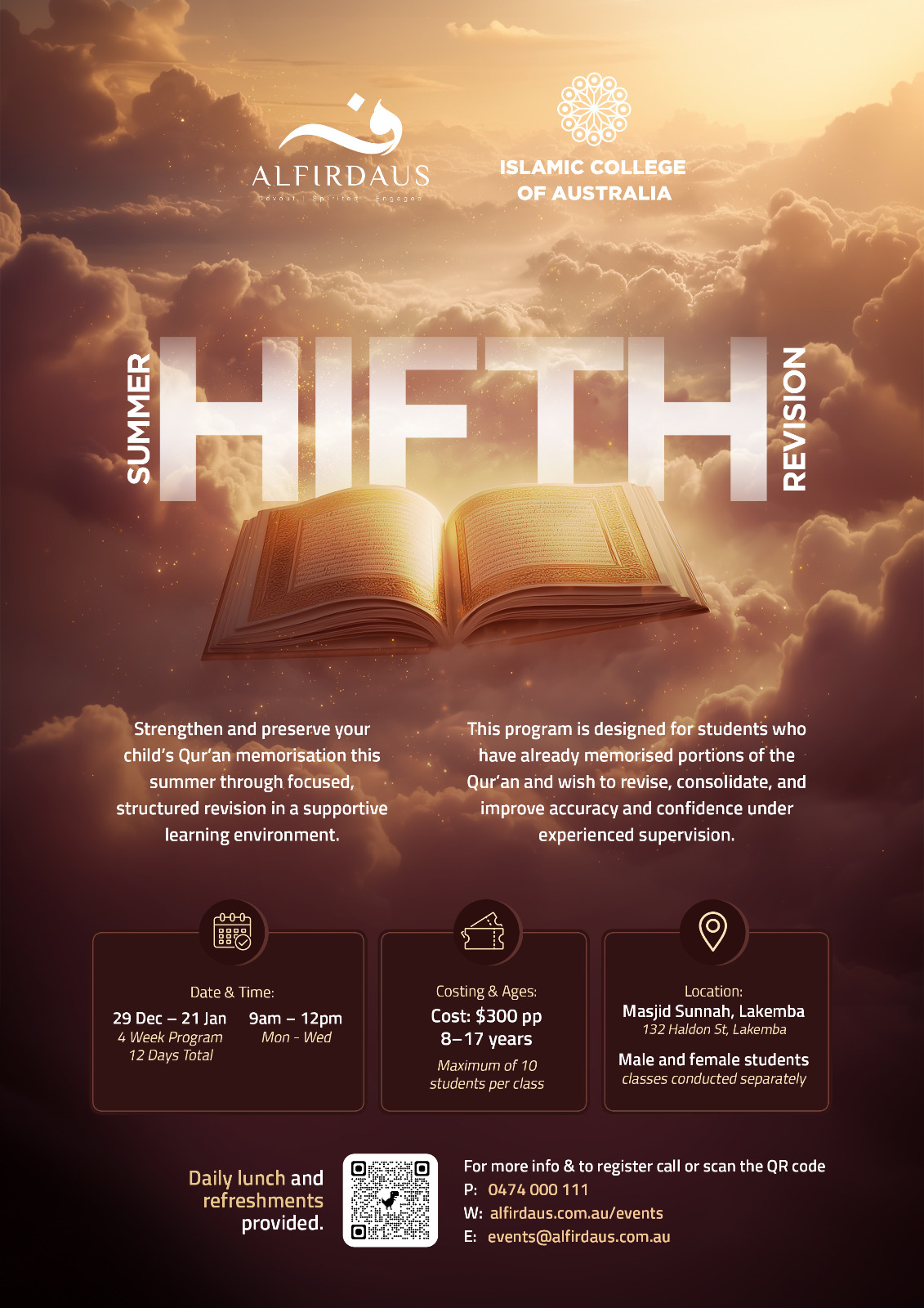 Our Summer Hifth Revision Program is designed for students who have already memorised portions of the Qur’an and wish to revise, consolidate, and improve accuracy, fluency, and confidence under the guidance of experienced teachers. Through structured daily revision and close supervision, students will reinforce what they have memorised and build strong revision habits.