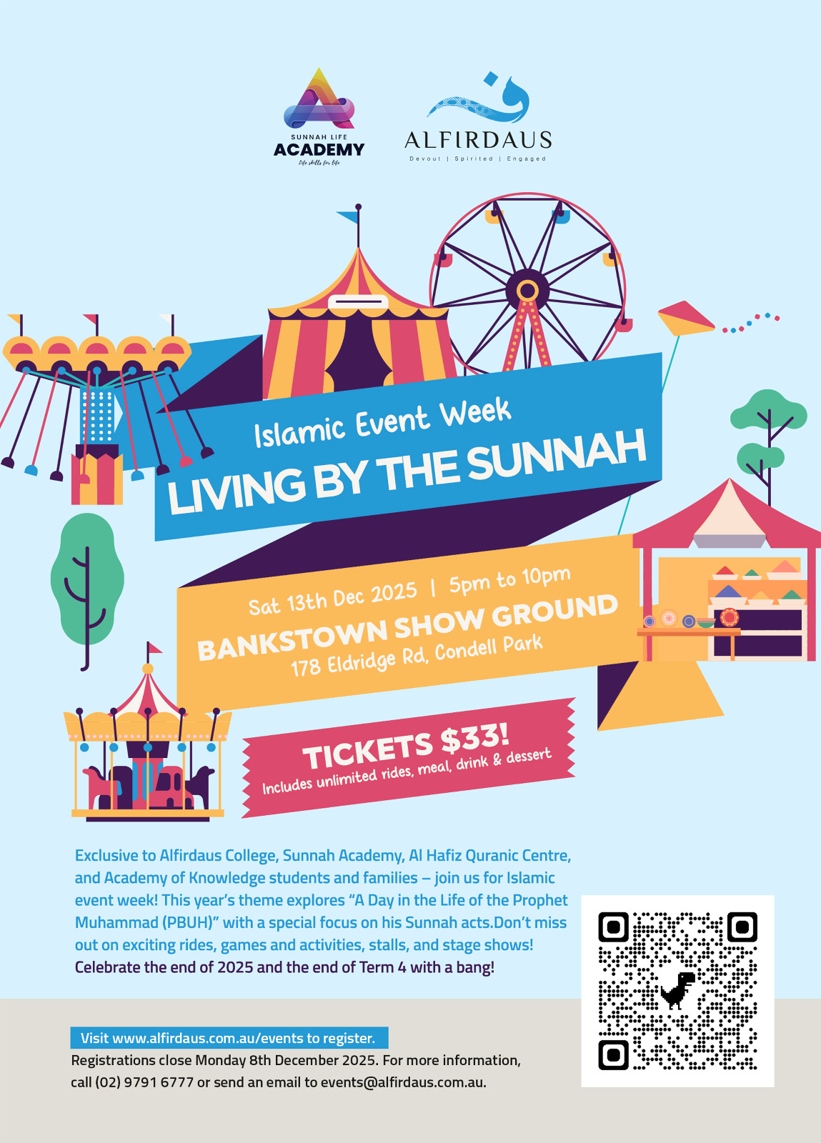 Exclusive to Alfirdaus College, Al Hafiz Quranic Centre, Academy of Knowledge and Sunnah Life Academy students ONLY – join us for Islamic Event Week! This year’s theme explores “A day in the Life of the Prophet Muhammad (PBUH)” with a special focus on his Sunnah acts.