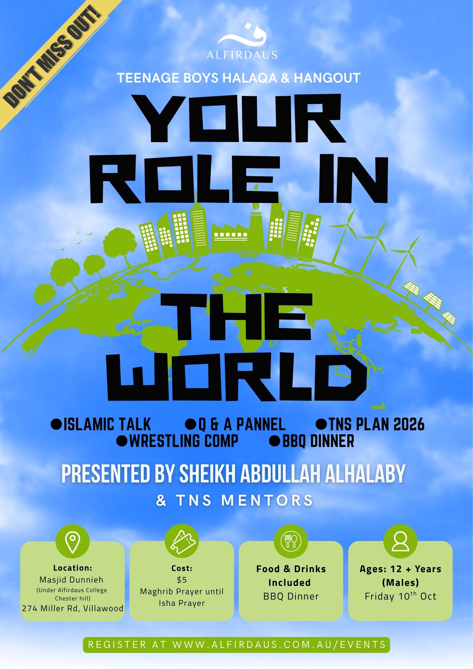 Join us for a powerful evening of brotherhood, learning and action under the guidance of Sheikh Abdullah Alhalaby & TNS Mentors, proudly presented by Alfirdaus (Chester Hill).